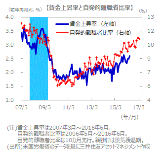 ■賃金上昇率は前月比+0.1%、前年同月比で+2.6%となり、それぞれ市場予想の+0.2%、+2.7%を下回りました。もっとも、自発的離職者比率の上昇が示す通り、労働需給は引き締まりつつあり、賃金上昇率も緩やかながら加速しています。