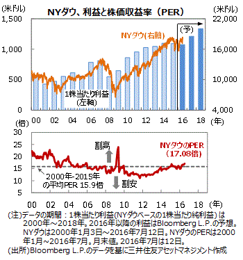 ■2016年の1株当たり利益(NYダウベース)は前年比で▲1.6%と減益の見通しです。しかし、17年は同+12.7%、18年は同+10.5%と2桁の増益が期待されています。引き続き米国の内需が堅調なこと、資源価格が下げ止まりつつあることなどから、今後は企業収益の改善が見込まれます。
