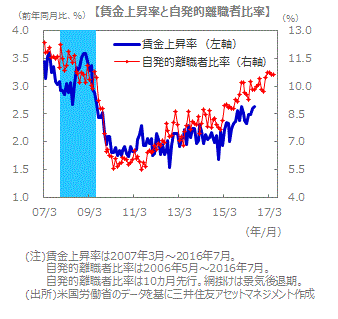 ■賃金上昇率は前月比+0.3%と、市場予想の+0.2%を上回りました。前年同月比では+2.6%となります。労働需給の引き締まり度合いを測る尺度である自発的離職者比率の後を追うように、賃金上昇率も徐々に高まってきました。
