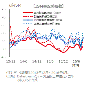 ■米国経済の先行指標として知られるISM製造業景況感指数は2016年9月に、総合指数が51.5となりました。8月は49.4と50を割り込みましたが、一時的な下振れだったと考えられます。