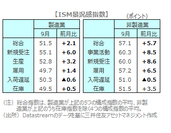 ■9月のISM指数は、米景気の拡大基調に変化のないことを示唆するものです。雇用指数から判断する限り、8月の非農業雇用者数の下振れも一時的なものに止まる公算が大きいと考えられます。これらから見て、米連邦準備制度理事会(FRB)は近い将来、利上げに踏み切ると予想されます。