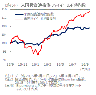 ■社債の発行市場も、活況を呈しています。米証券業金融市場協会(SIFMA)の統計によれば、2016年1~9月の発行額は社債全体で1兆2,553億ドル、前年同期比4.7%増、うち投資適格債は1兆671億ドル、同9.7%増でした。