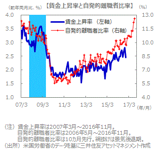 ■他方、賃金上昇率は前月比0.1%の減少となりました。前月が同0.4%増と大幅に伸びた反動と考えられます。前年同月比でも2.5%増と前月の同2.8%増から鈍化しましたが、自発的離職者比率の上昇が示す通り、労働需給が引き締まってきていることから、今後、再加速が見込まれます。