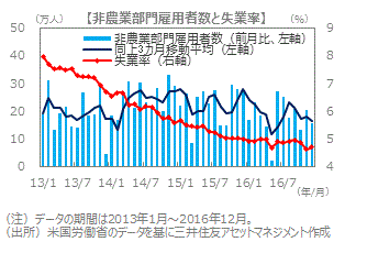 ■2016年12月の非農業部門雇用者数は前月比15.6万人増となり、市場予想(ブルームバーグ集計)の同17.5万人増を下回りました。