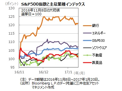 ■トランプ大統領は、20日に医療保険制度改革(オバマケア)の見直しを支持する大統領令に署名し、環太平洋パートナーシップ協定(TPP)からの離脱を表明しました。また、今後10年間で2,500万人の雇用創出、国内エネルギー開発の推進等も表明しました。今後は通商政策等も明らかになってくると思われますが、足元では閣僚が揃っておらず、多少時間がかかるかもしれません。