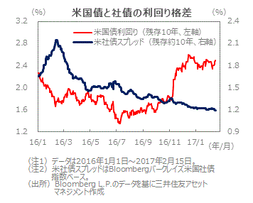 ■米国10年国債利回りは、2016年11月の大統領選でトランプ氏が勝利したため、公約の財政支出拡大や減税による景気回復期待を織り込み、12月中旬までは上昇しました。その後は年明けにかけて一旦低下し、足元では一進一退で推移しています。財政拡大や減税実施には時間がかかる見通しで、米連邦準備制度理事会(FRB)による利上げも緩やかなペースとなるとの見方などが、その背景です。