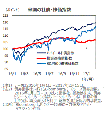■政府による大規模な財政支出拡大や減税などが早期に決まるようであれば、国債利回りには上昇圧力がかかることが考えられます。しかし、トランプ大統領が公約したような大規模な景気刺激策には米国議会での審議長期化も予想され、加えて、FRBによる利上げ速度も緩やかと見込まれるなか、金利は一進一退での推移になる見通しです。社債については、相対的に高水準の利子収入が得られる資産として人気が高く、引き続き資金流入が続く見込みです。