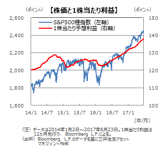 ■なお、トムソン・ロイターズ社によれば、米国企業の予想増益率(対象はS&P500種指数の1株当たり利益)は、17年が前年比+11.4%、18年が同+11.7%と、ともに二桁の増益が見込まれています(予想は6月22日時点のもの)。
