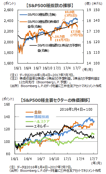■S&P500種指数の主なセクターを見ると、17年に入ってからエネルギーセクターが原油価格の下落等の影響から低下基調が続いています。一方、時価総額で同指数の20%程度を占める情報技術セクターと15%程度を占める金融セクターがけん引役となって堅調に推移しています。今回足元で株価が小幅に調整していますが、これは情報技術セクターの調整が背景となっています。ここまで堅調に推移してきたことで利益確定売りが増加しました。