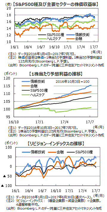 ■情報技術セクターの下落は、やや行き過ぎた株価水準の調整と考えられます。調整を経た7月7日の情報技術セクターの株価収益率は17.3倍とS&P500種を若干下回る水準まで低下しました。