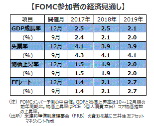■FOMC参加者の経済予測は、9月時点に比べ成長率が上方修正、失業率は下方修正されました。現在、米議会で審議されている税制改正(減税等)の影響を反映させたと見られます。