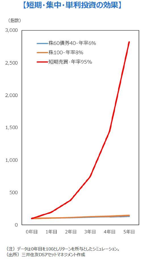 ■このように、投資は「短期・集中・単利」が最も効率よく、凄まじいリターンを享受することが可能です。ただ最大の問題は、それが実践できるかということです。