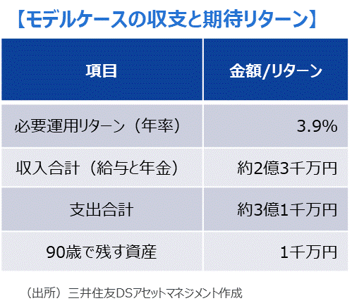 ■この場合、弊社の試算によると、3.9%程度で運用することが必要になります。ゴールを仮に90歳と想定し全体を通算すると、想定される給与と年金収入は約2億3千万円となります。一方、支出金額は約3億1千万円です。これに当初の貯蓄額2千万円を加え、90歳で1千万円残るように運用利回りを計算したものです。