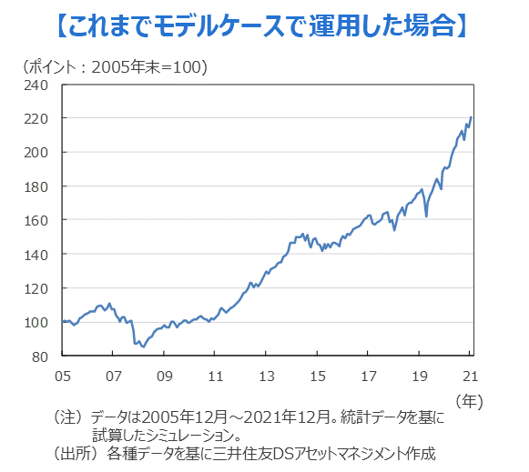 ■参考までに、2005年末に前述の資産配分を行って運用した場合の運用成果を図示しました。2008年のリーマン危機、2015年のチャイナショック、2020年のコロナショック等、株式市場が大きく下落したり、停滞する局面が何度がありましたが、その都度回復し、16年間で運用資産は2.2倍になりました。