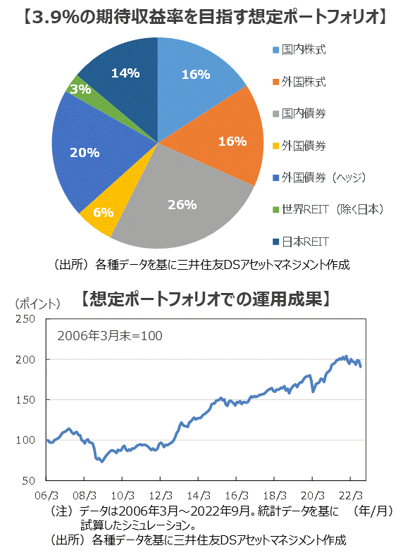 ■まず、期待収益率の3.9%という水準ですが、私たちの国民年金、厚生年金を運用する年金積立金管理運用独立行政法人(GPIF)の2001年度~2021年度の運用成果は年率3.69%です。GPIFは内外の株式や債券に分散投資しています。私たちも同じようなスタンスで十分に分散したポートフォリオで資産運用を行えば、3.9%の収益率は無理のない範囲だと判断されます。