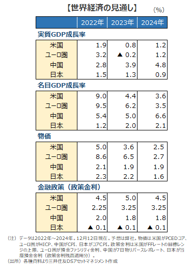 ■2023年は米国の実質GDP成長率が0.8%と予想されるなど、世界経済は低成長となる見通しです。年前半は、物価高と金融引き締めの影響により米経済が減速し、欧州は年を通して景気が悪化すると予想されるためです。加えて、中国経済は不動産問題とゼロコロナ政策の影響が残るとみています。