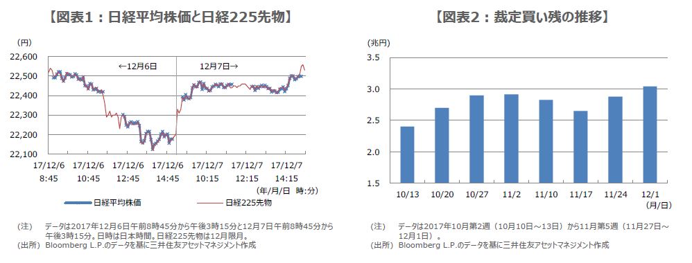 12月8日は、先物とオプションを同時に決済する「メジャーSQ」の算出日でした。先物やオプションを売買している投資家は、取引最終日(SQ算出日の前営業日、すなわち12月7日)までに、ポジションをどうするか判断しなければなりません。日本では直近限月に取引が集中する傾向がみられ、SQに絡み現物が大きく動くことがあります。実際、日経平均株価は12月6日に大きく下落し、12月7日には大きく上昇しました(図表1)。今回はこの仕組みを探っていきます。