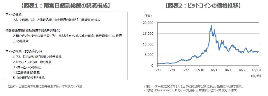 日銀の雨宮正佳副総裁は10月20日、日本金融学会の秋季大会において「マネーの将来」というテーマで講演を行いました。その内容は、今後の金融経済や中央銀行のあり方を考える上で非常に有益であったため、今回のレポートではその概要をお伝えします。講演では、マネーの成り立ちと機能の振り返り、情報技術革新と支払決裁手段のデジタル化の進展、マネーの将来像の展望、という流れで話が進みました(図表1)。