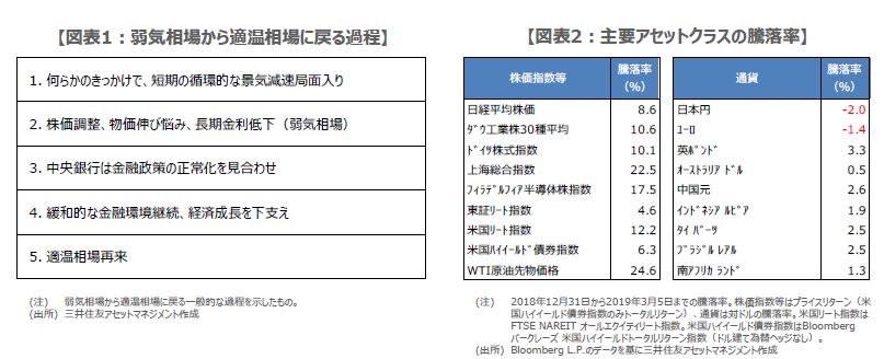 2018年の米金融当局の政策運営や、同年10月までの金融市場はこのような状況にあったと思われます。しかしながら、前述の通り、2018年10月から12月にかけて相場は弱気方向へ傾きました。この場合、幾分引き締め気味に政策を微調整していた中央銀行はいったんその調整を見合わせ、その他の中央銀行は従来通り緩和的な政策運営を維持することになるため、ちょうどよい加減の適温相場が再来します(図表1)。