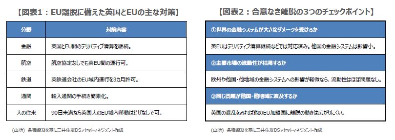 一般に市場で悪材料が発生した場合、確認すべきは、①世界の金融システムが大きなダメージを受けるか、②主要市場の流動性が枯渇するか、③同じ問題が他国・他地域に波及するか、の3点です。いずれも該当しなければ、それほど心配する必要はありません。合意なし離脱は欧州経済への影響は大きいものの、必ずしもこの3点に該当するとはいえません(図表2)。そのため、短期的には市場へのインパクトは大きいものの、長期にわたって世界の金融市場が混乱し続ける可能性は低いと思われます。