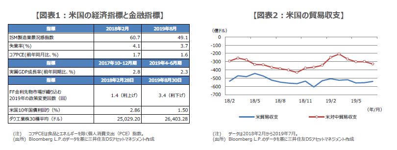 今回のレポートでは、昨年から続く米中両国による関税引き上げ合戦で、世界の金融市場や米中の経済環境は、どのように変化したかを検証します。トランプ米大統領が、少なくとも500億ドル相当の中国製品に25%の輸入関税を課す(後の制裁関税第1弾と第2弾)と表明したのは、2018年3月22日でした。そこで、主要指標について、2018年2月と2019年8月の数値を比較してみます。