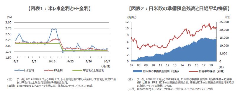 これを受け、米連邦準備制度理事会(FRB)は9月17日以降、臨時措置として、金融機関に対し国債などを担保に資金供給を行うシステムレポを実施し、金利上昇の抑制に努めました。その結果、レポ金利とFF金利の上昇傾向に、いったん歯止めがかかりました(図表1)。ただ、10月10日までの予定だったシステムレポは、11月4日まで継続されることとなり、FRBは金利の操作に苦労しています。