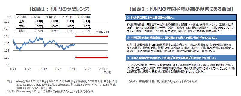 ●ドル円相場の年間の値幅は縮小傾向にあり、2020年も比較的狭いレンジで推移するとみている。