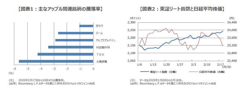 2月18日の東京株式市場では、村田製作所やTDK、アルプスアルパインなど、いわゆるアップル関連銘柄が軒並み下落しました(図表1)。このほか、半導体製造装置メーカーや工作機械メーカーにも、業績下方修正の思惑から、売りが広がりました。17日が休場だった米国株式市場では、18日のアップル株の動向が注目されましたが、前営業日比1.8%安にとどまり、大幅な下落は回避されました。