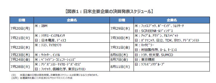 来週に決算発表を予定している主な米企業は、テキサス・インスツルメンツ(21日、現地時間、以下同じ)、テスラとマイクロソフト(22日)、ツイッターとインテル(23日)などです(図表1)。また、翌週の29日にはフェィスブック、30日にはアップル、アマゾン、グーグルの持株会社アルファベットの決算が予定されています。決算を経て、ハイテク銘柄が米国株式市場を牽引する流れが継続すれば、日本株にも好材料です。
