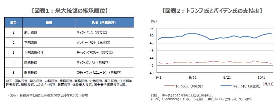 トランプ氏は10月3日、ツイッターにビデオメッセージを投稿し、体調はよくなっており、今後数日間が正念場になるとの考えを示しました。トランプ氏は入院先から執務にあたっていますが、仮に執務不能となった場合は、ペンス副大統領に権限が一時的に委譲されることになります。また、ペンス氏も執務不能となった場合は、ペロシ下院議長が大統領代行となり、以下、図表1の順番で権限が継承されます。