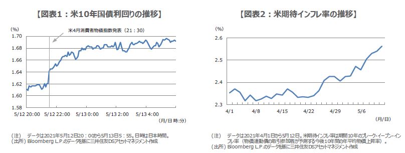②について、市場はFRBの物価上昇は一時的という見方にやや疑念を抱いているように思われます。FRBのクラリダ副議長は5月12日、4月の米CPIの結果を受け、物価上昇は主に一過性の要因によるものであると述べ、従来のFRBの見解を繰り返しました。ただ、米期待インフレ率はこのところ上昇傾向が続いており、同日も上昇の動きがみられました(図表2)。