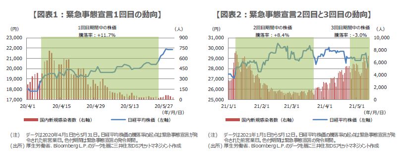 過去2回の緊急事態宣言中の株高は、宣言発令後の新規感染者数の減少を受け、株式市場が宣言解除後の経済活動再開を織り込んだことによるものと推測されます。そして、今回3回目の緊急事態宣言は、前述の通り4月25日に発令され、対象地域は現在6都府県となっています。今回は、まだ新規感染者数に減少傾向はみられず、日経平均株価は5月12日まで3.0%下落しています(図表2)。