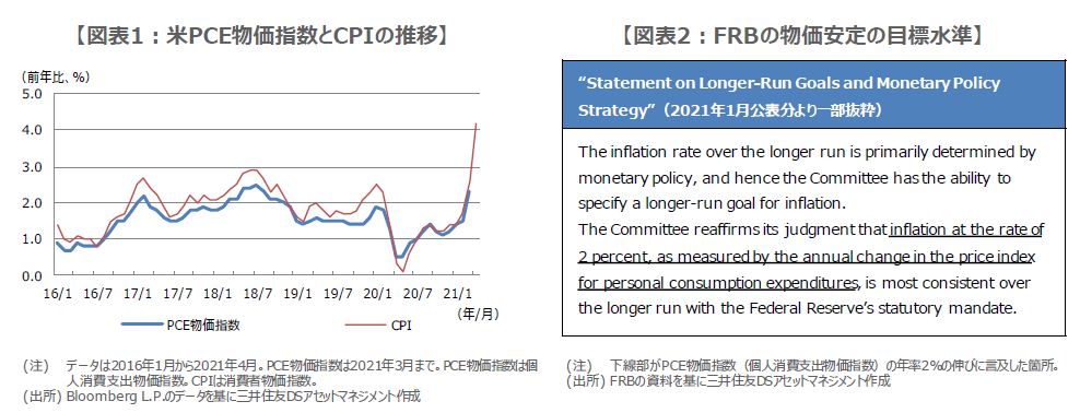 先週の米株安は、市場が後者の解釈をし、FRBの物価安定手腕に対する信頼が低下したことによるものと推測されます。弊社は米国の物価について、FRBと同様、上振れは一時的な現象であるとみていますが、株式市場が懸念しているように、物価の大幅な伸びが継続していくのか、その見極めには、今後発表される物価などの経済指標を待つ必要があると思われます。