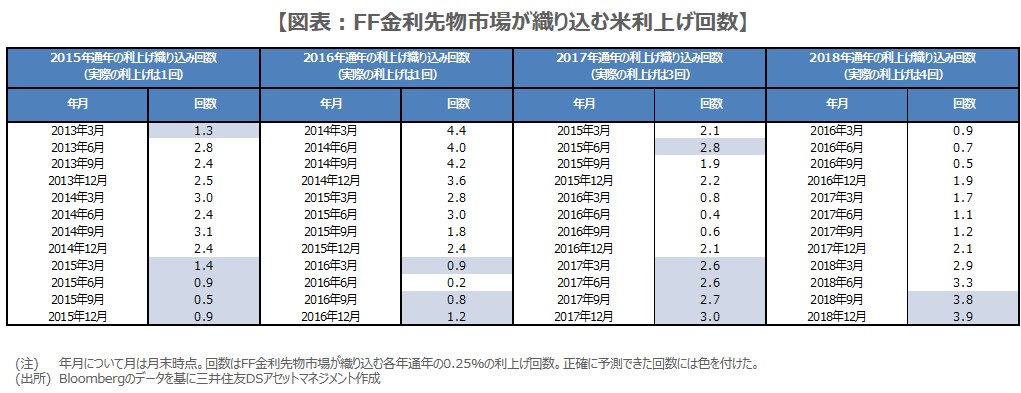 米国では前回、2015年12月に最初の利上げが行われましたが、2015年の利上げはこの1回のみでした。FF金利先物市場が織り込む2015年通年の利上げ回数をみると、2013年3月末時点で1.3回(利上げ幅は0.25%、以下同じ)となっていますので、市場は正しく予測できていたことになります(図表)。ただ、その後、同市場が織り込む利上げ回数は増加し、再び正しく予測できたのは、2015年に入ってからでした。