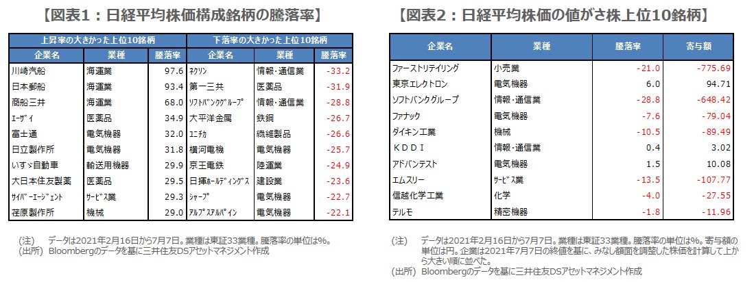 次に、下落した117銘柄のうち、下落率の大きい10銘柄も図表1の通りです。昨年好調だった情報・通信業などが大きく下げていますが、117銘柄全体でも、コロナの感染拡大が追い風となった銘柄の調整がみられます。なお、検証期間における日経平均株価の変化幅は約2,100円のマイナスでしたが、これに対する寄与額は、上昇した108銘柄が約920円のプラスに対し、下落した117銘柄は約3,020円のマイナスでした。