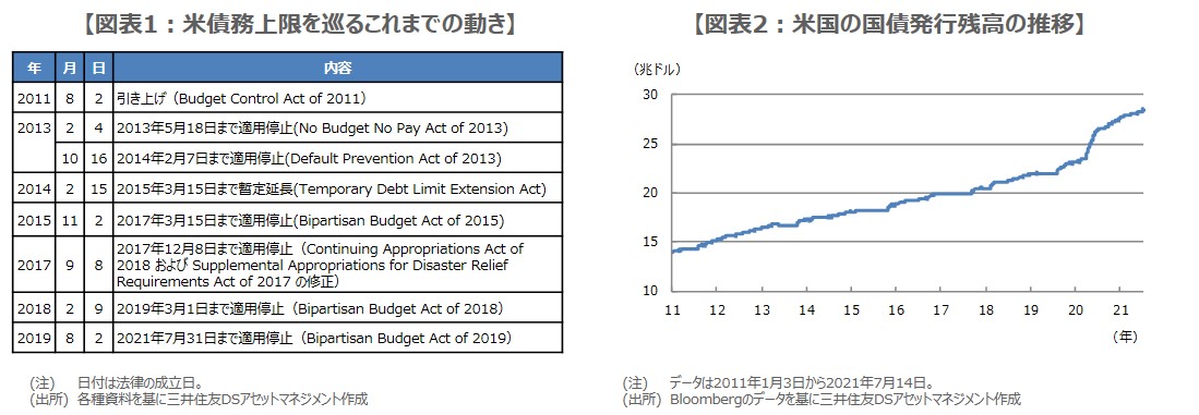 最近では、2019年8月2日に成立した超党派予算法(Bipartisan Budget Act of 2019)により、債務上限の適用が2021年7月31日まで停止されていました。適用停止期限が過ぎたため、債務上限は今月1日から復活しています。これを受けて、米財務省は現在、一部の公的年金基金への新たな資金拠出を制限するなどの特例措置を講じ、手元資金をやり繰りしています。