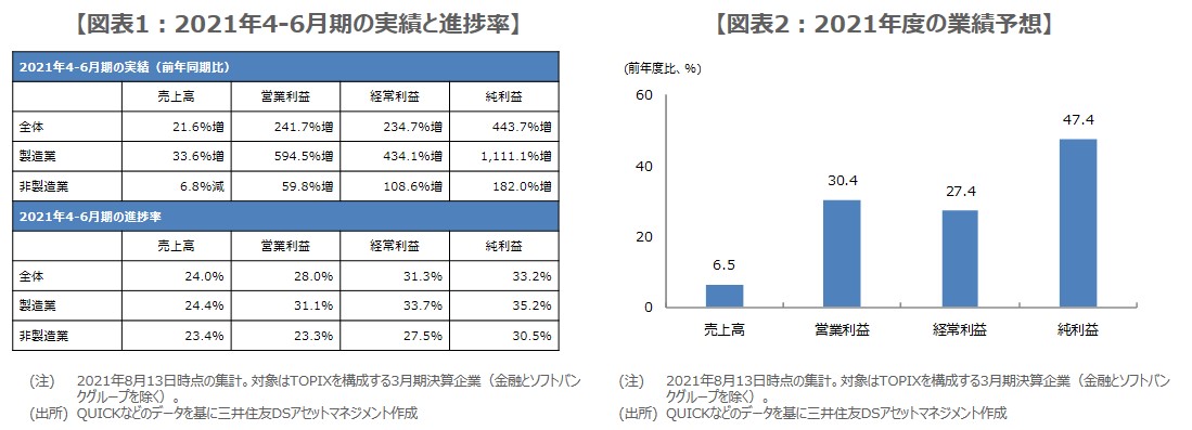 進捗率については、売上高が24.0%、営業利益は28.0%、経常利益は31.3%、純利益は33.2%となり、利益の実績は4-6月期の目安となる25%を上回りました(図表1)。以上より、2021年4-6月期決算は、総じて良好な内容と考えられますが、株価の動きをみると、決算発表が本格化する前の7月16日から8月16日までの期間、日経平均株価は1.7%、TOPIXは0.4%、それぞれ下落しています。