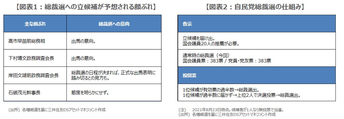 菅首相の自民党総裁としての任期は9月30日までとなっており、横浜市長選の結果を受け、自民党総裁選の行方に注目が集まっています。自民党は8月26日に党選挙管理委員会を開き、総裁選の日程を決める予定です。報道によれば、9月17日告示、29日投開票となる公算が大きく、党内には新たな選挙の顔を求める動きもあることから、複数の候補が総裁選に出馬する見通しです。