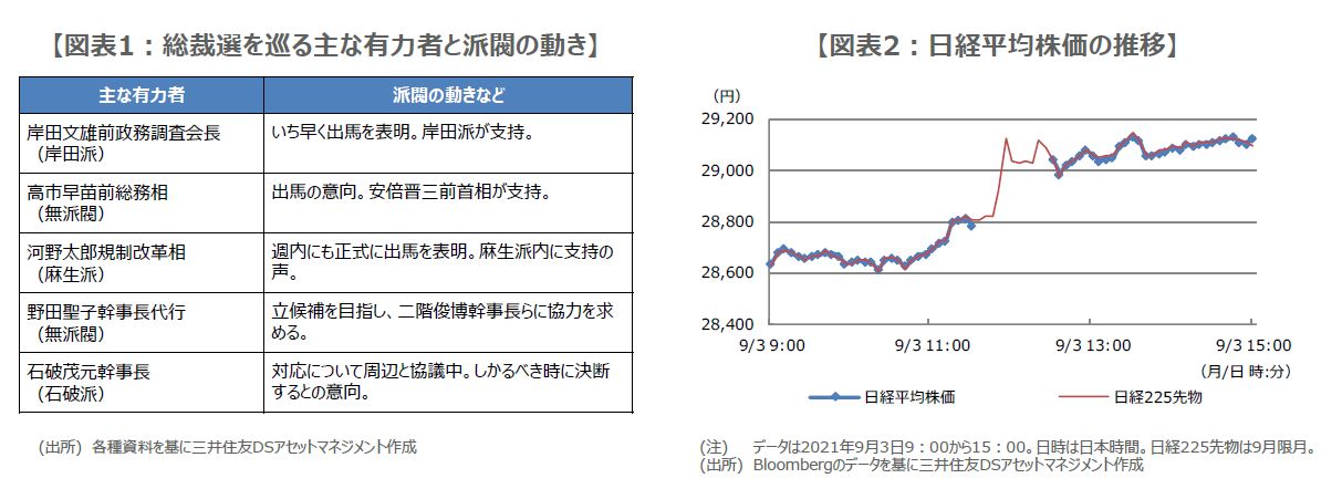 2020年9月の総裁選は、主要派閥が支持した菅氏の圧勝となりましたが、今回は支持する候補の一本化が困難な派閥もあり(図表1)、また、3年ぶりに国会議員票と同数の党員・党友票を争う本格的な選挙戦になるため、結果は見通しにくくなっています。しかしながら、誰が新総裁となっても、コロナ禍の現状では、緩和的な金融政策と拡張的な財政政策という、与党の基本方針は変わらないと思われます。