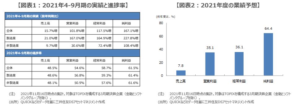 進捗率については、売上高が48.5%、営業利益は54.6%、経常利益は58.7%、純利益は61.5%となり、利益については4-9月期の目安となる50%を上回りました(図表1)。以上より、2021年4-9月期決算は、総じて良好な内容と判断されますが、株価の動きはやや控えめで、決算発表が本格化する前の10月22日から11月17日までの期間、日経平均株価は3.1%の上昇、TOPIXは1.8%の上昇にとどまっています。