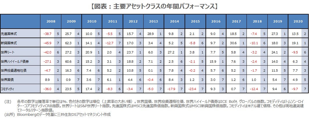 今回のレポートでは、主要アセットクラスについて、長期のパフォーマンスを分析します。具体的には、先進国株式、新興国株式、世界リート、世界ハイイールド債券、世界投資適格社債、世界国債、コモディティの7つのアセットクラスについて、2008年から2020年までの13年間のパフォーマンスを振り返ります。各年の騰落率と順位をまとめたものは、図表の通りです。