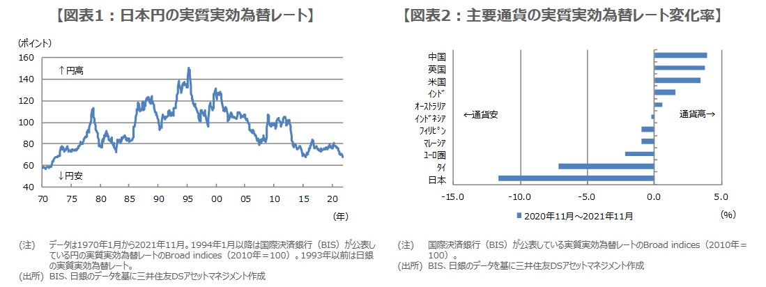 なお、日本円の実質実効為替レートは、2021年11月時点で67.79ポイントとなっています。67ポイント台は、直近で2015年6月にもつけていますが、おおよそ1972年の水準です。ただ、これをもって「日本円は安い」というよりも、前述の通り、過去の高すぎる評価からの修正を経ているため、「日本円は約50年ぶりに元の水準に戻った」という方が、適切のように思われます。