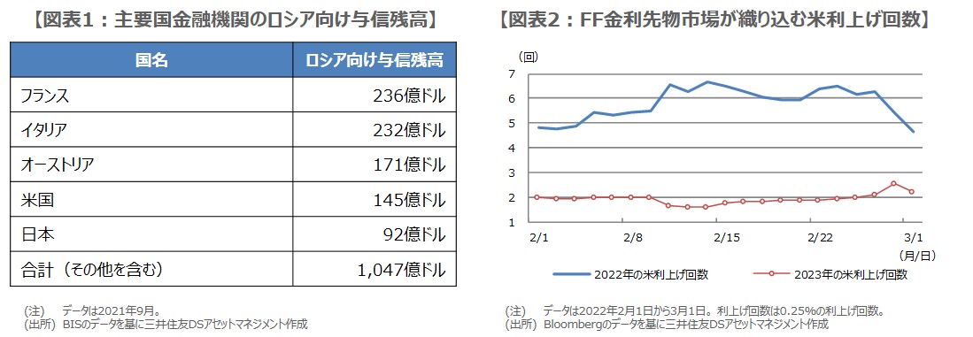 なお、フェデラルファンド(FF)金利先物市場では、このところ米利上げの織り込みが後退しつつあります(図表2)。ただ、前述の通り、SWIFT排除に関する西側諸国の配慮次第で、インフレと景気減速への懸念は軽減される余地があり、また、金融システム動揺の恐れも小さいとみられるため、米連邦準備制度理事会(FRB)は今月から利上げを開始し、よほど状況が急変しない限り、しばらく利上げ姿勢を維持する可能性が高いと考えています。