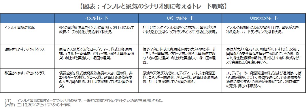 インフレトレードでは一般に、原油や天然ガスなどの国際商品(コモディティー)が選好され、利上げによる金利上昇の影響を受けやすい債券は敬遠されやすくなります(図表)。また、株式については、国・地域別では資源国株、セクター別ではエネルギー関連株、スタイル別ではバリュー株が選好され、通貨については、資源国の通貨や、利上げを実施している国の通貨が選好されやすくなります。