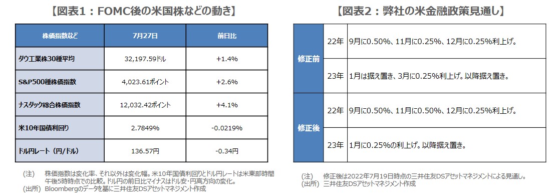 パウエル議長が、利上げ判断はデータ次第としながらも、利上げペースを緩める可能性に言及したことから、7月27日の米国市場は、株価上昇、長期金利低下、ドル円はドル安・円高で反応しました(図表1)。また、フェデラルファンド(FF)金利先物市場では、9月に0.50%、11月と12月に0.25%ずつの利上げという見方が強まっており、利上げペースの鈍化が意識されている状況です。