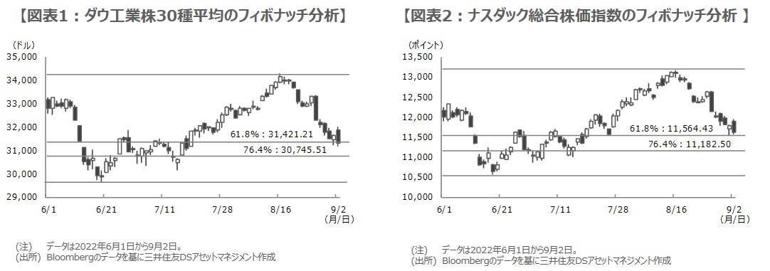 まず、ダウ平均について、年初来安値から直近高値までの上げ幅は、4,628ドル07セントですので、直近高値から61.8%押した水準は、31,421ドル21セントになります(ローソク足チャートにおける高値・安値で計算、以下同じ)。ただ、9月1日と2日の取引時間中、すでにこの水準を下抜けているため、次は76.4%押した水準の30,745ドル51セントが下値目途となります(図表1)。