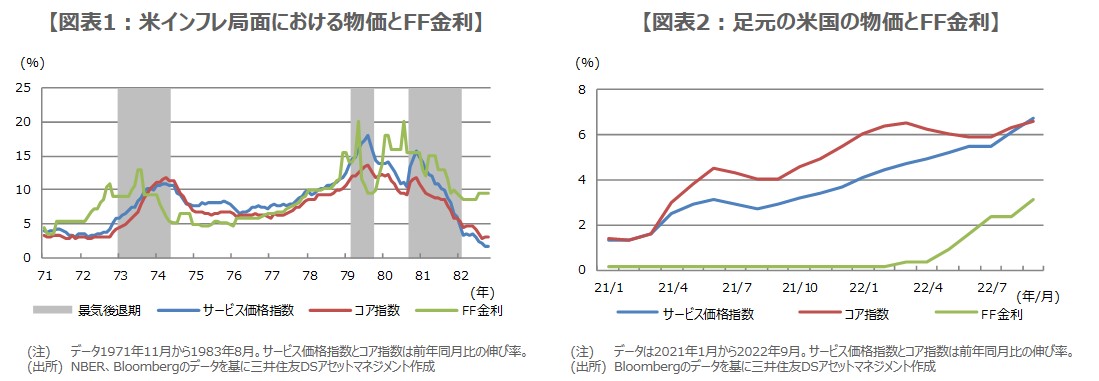 通貨供給量が抑制されるなか、FF金利は1980年3月と1981年5月に、物価の伸びを大きく上回る20%に達しましたが、物価の伸びが1ケタに落ち着いてきた1982年以降、通貨供給量の緩和とともに、低下へ向かいました。このように、過去の例を踏まえると、インフレ沈静化には、物価の伸びを上回る大胆な利上げや、量の引き締めが必要と思われ、現段階では(図表2)、更なる利上げのリスクも、いくらか考慮しておいた方が良いと考えます。