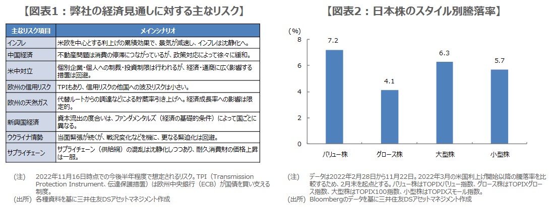以上より、2023年にかけて、世界経済の成長率が鈍化する見通しであることや、米国景気が現在の減速初期から減速後期に進む可能性が高いことを踏まえると、日本株の今後については、少し慎重な見方が必要と考えます。日本株についてスタイル別に、2022年2月28日から直近までの上昇率をみると、グロース株よりもバリュー株、小型株よりも大型株が上回っていることが分かります(図表2)。