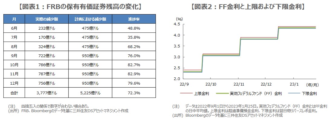 2022年6月から12月までの7カ月間でみた場合、保有有価証券残高は3,777億ドル減少しましたが、進捗率は72.3%と、計画より遅れている状況です。なお、2017年10月から開始された前回のQTでは、準備預金が急減し、短期金融市場に資金を出し渋る金融機関が増え、フェデラルファンド(FF)金利が急騰する場面もみられました。その結果、FRBは2019年9月にQTを終了し、翌月から短期国債の購入を再開しました。