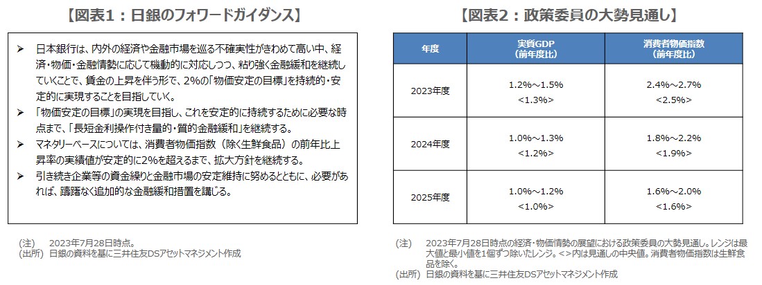 日銀植田新体制がスタートした4月以降、総裁・副総裁など政策委員会メンバーの発言を踏まえると、日銀の金融政策を見通す上では、①物価目標の実現までの距離感、②賃上げの動向、を見極めることが重要と考えています。したがって、①については、メンバーの物価見通しに関する発言や、「経済・物価情勢の展望」(展望レポート)における物価見通しが(図表2)、②については、2024年の春闘が、それぞれ注目されます。